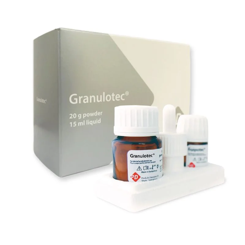 Granulotec est une préparation sans eugénol, bactéricide, non résorbable et radio-opaque pour l’obturation permanente, après pulpectomie et traitement canalaire, des canaux radiculaires infectés, même en présence d’un granulome.