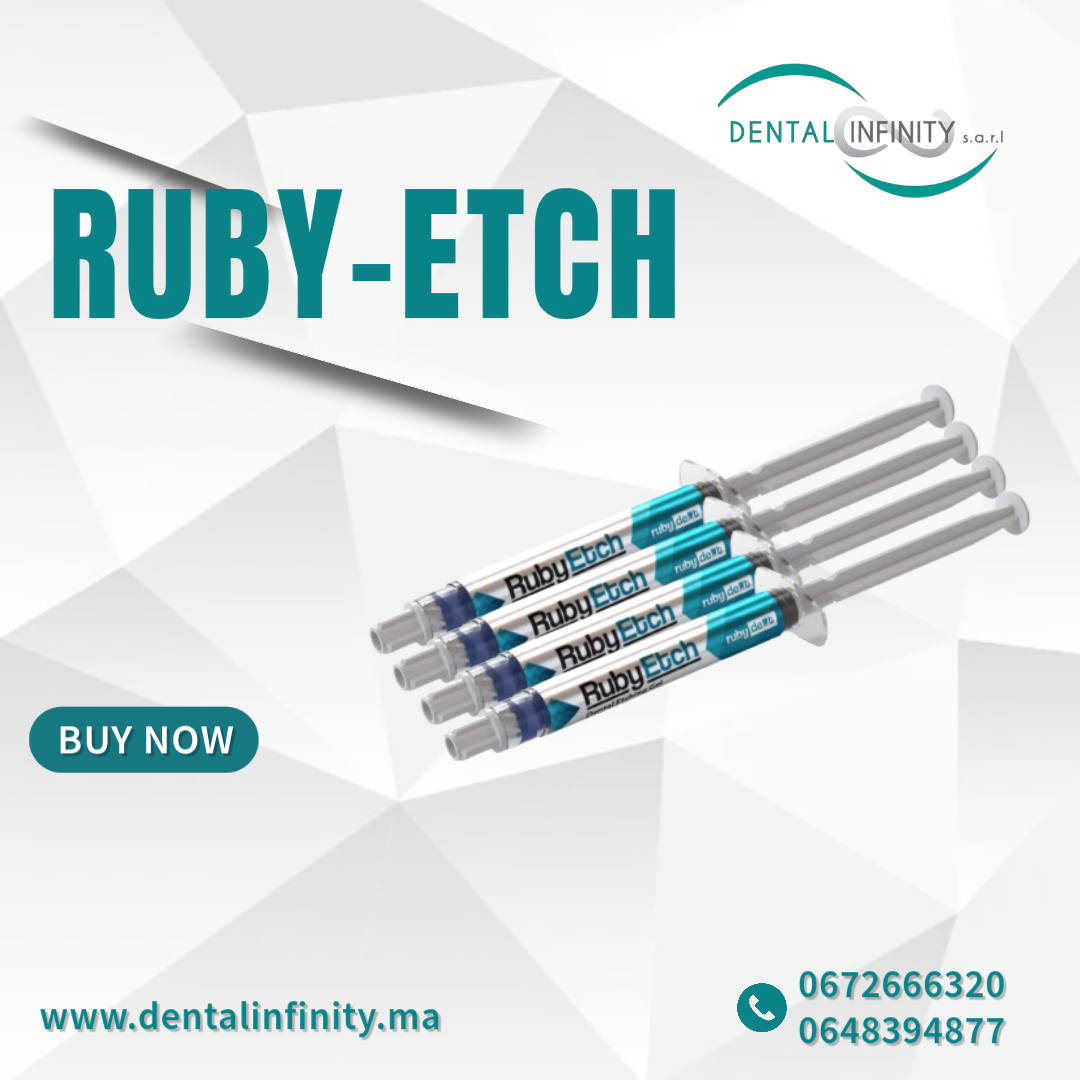 RubyEtch (acide phosphorique) : Ce gel de mordançage contient 37 % d’acide phosphorique. Il est utilisé pour éliminer la couche de débris dentinaires et rendre rugueuses les surfaces de l’émail et de la dentine afin d’optimiser l’adhérence des adhésifs et des composites. De couleur bleue pour une meilleure visibilité lors de l’application, il se rince facilement.